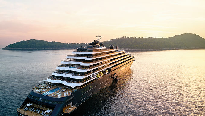 The Evrima made history by becoming the first luxury hotel brand to launch its own cruise line when it debuted in October 2022. This 624-foot "superyacht" is designed to blend the casual freedom of yachting with the esteemed luxury lifestyle of The Ritz-Carlton brand. It is an intimate vessel, accommodating only 298 guests in 149 all-suite cabins, each featuring a private ocean-view terrace. The onboard experience is defined by highly personalized service (nearly one crew member for every guest), Michelin-inspired dining across five venues, and a marina platform offering direct access to the sea for water sports.